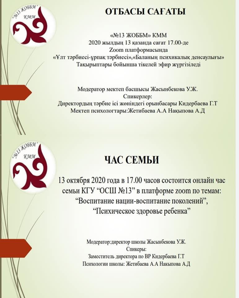 Отбасы сағаты. Кезекті отбасы сағатында отбасындағы бала тәрбиесі, бала тәрбиесіндегі ұлттық құндылық, гендерлік мәселелер; Баланың психикалық денсаулығы жөнінде тақырыптық ақпарат алмасу, ой бөлісу болды.