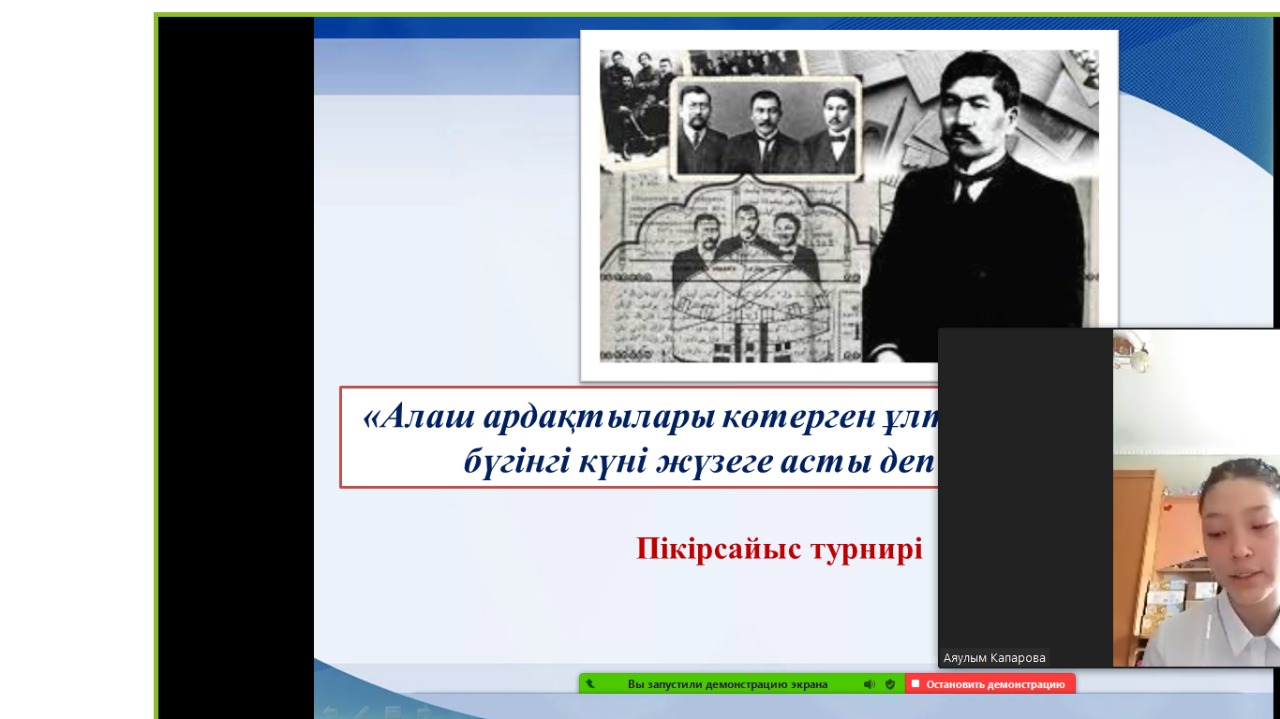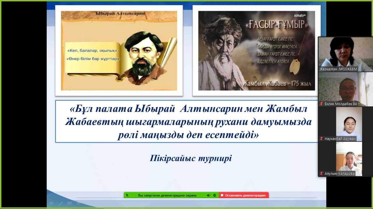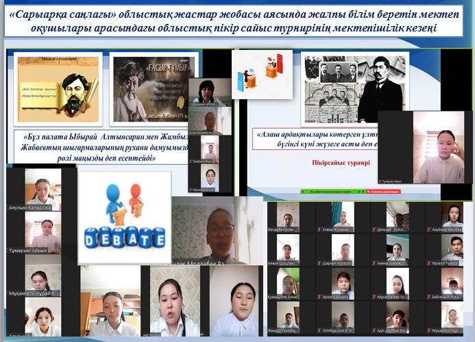 Мектебіміздегі «Сөз шебері» дебат үйірмесінің жетекшісі Лаззат Абдраманованың ұйымдастыруымен "Сарыарқа саңлағы" облыстық жастар жобасы аясында облыстық пікір- сайыс турнирінің мектепшілік кезеңі өткізілді. Турнирге үйірме қатысушыларынан құрылған "Жалын" , " Мұрагер" топтары қатысты. Ұлы тұлғалардың өнегелі ісін жалғастырып, ұлт болашағы үшін еңбек ету жолындағы бағдарламалар сөз болды. Ыбырай Алтынсарин мен Жамбыл Жабаевтың шығармаларының рухани дамудағы рөлінің маңыздылығын атап өтті. Алаш ардақтылары көтерген ұлттық идеялардың бүгінгі күні жүзеге асты деп есептей отырып, баршамыз бірлік туы астында бақытқа бірге жетейік деген ойларын өз кейстері арқылы дәлелдей білді. Турнир қорытындысы бойынша "Мұрагер" тобы қалалық кезеңге жолдама алды.