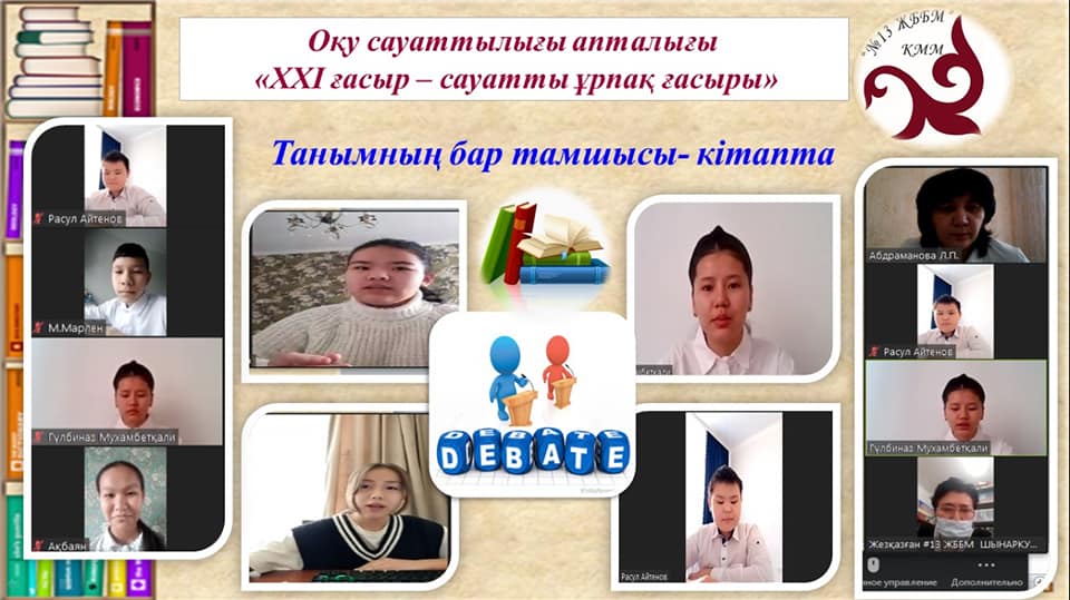 "Дебат" пікір сайыс клубының жетекшісі Л. Абдраманова мен мектеп Парламенті "Дебат қозғалысы" фракциясының министрі А. Мәжиттің жетекшілігімен 8 сынып оқушылары арасында "Танымның бар тамшысы-кітапта" тақырыбында пікір сайыс болып өтті. "Жасын" және " Ақиқат " топтары қатысып, егер бір адам кітап оқымаса, бұл оның өз қасіреті, ал миллиондаған адамдар кітап оқымаса, тұтас бір ұлттың қасіреті, кітапханалардағы кітап қорында іздегеннің бəрі бар, соны алып оқитындар қатары өкінішке орай, тым аз екендігін, сонымен қатар жаһандық даму белгісіндегі түрлі желімен байланыс, өзіндік шығармашылық іздері-соның көлеңкесінде қалып жатқандығын тілге тиек етіп, өз ойларын ортаға салды. Кітаппен дос болу- өмір қажеттілігі,-деген ой пікірлерін айтты. "Дебат" клубының мүшелерімен бірге дебат қорытындысына талдау жасалды.