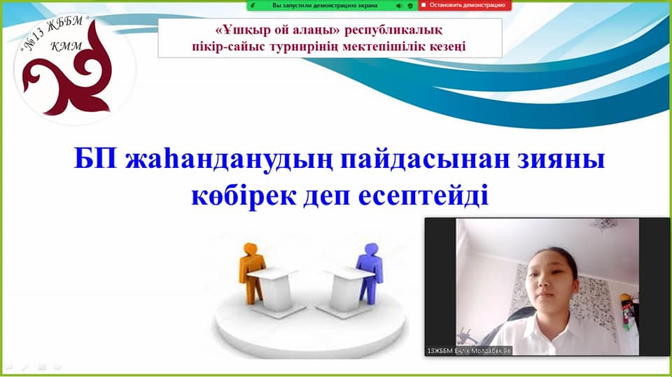 Мектебімізде "Ұшқыр ой алаңы" пікір-сайыс турнирінің мектепішілік кезеңі өтті. Турнирге 8-9 сынып оқушылары қатысты.Қарар тақырыбы :" БП ҚР қарулы күштерін модернизациялау механизімін ұсынады" ,"БП жаһанданудың пайдасынан зияны көбірек деп есептейді" тақырыптарындағы қарарлар бойынша пікір таластырды."Парасат" және" Жалын" тобындағы спикерлер ортаға тақырыптар бойынша өз кейстерін ұсынып : Қарулы Күштер агрессияға тойтарыс беруге, Қазақстан Республикасының аумақтық тұтастығы мен егемендігін қару-жарақпен қорғауға, мемлекеттік және әскери объектілерді күзетуге және қорғауға, әуе кеңістігін күзетуге, сондай-ақ Қазақстан Республикасы бекіткен халықаралық шарттарға сәйкес міндеттерді орындауға дайын болу керектігі пікірсайыста айтылды. "БП жаһанданудың пайдасынан зияны көбірек деп есептейді" тақырыбында жаһандану неге әкеліп соқтырады?сұрақ төңірегінде пікірсайыста оқушылар өз ойларын ортаға сала білді.Пікір сайыс нәтижесінде " Парасат" тобы қалалық дебат турниріне жолдама алды.