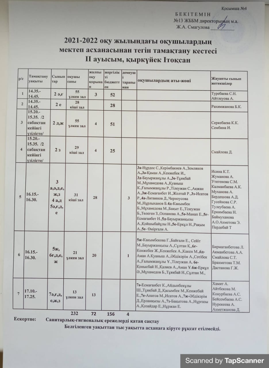 Оқушылардың тегін тамақтану кестесі ІІІ ауысым