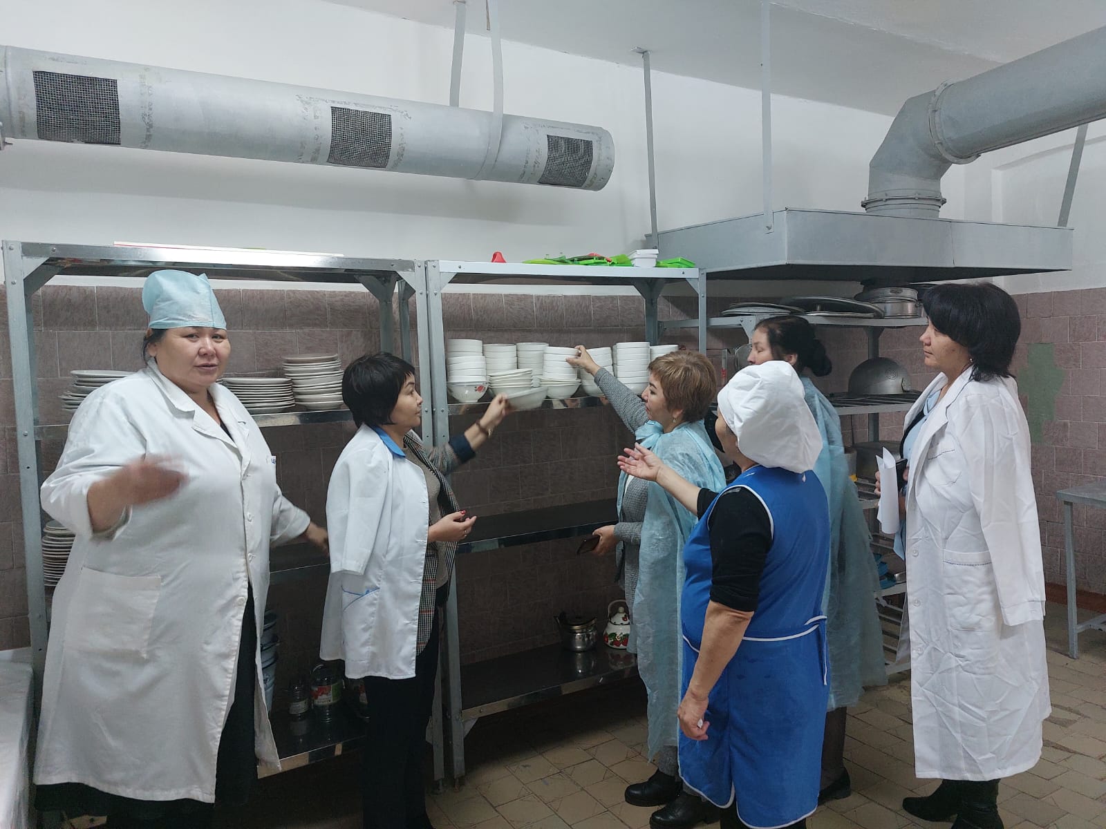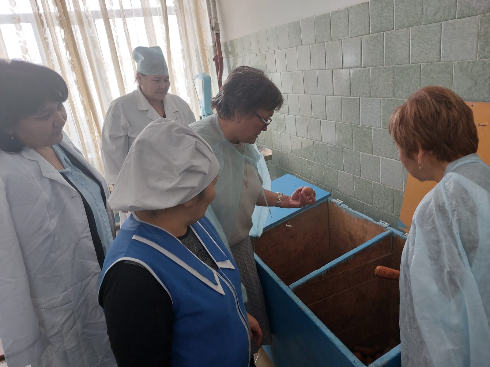 Тексеріс барысында күнделікті ас мәзірі мен дайын өнімнің шығуын (тәулік нормасын, көкөністердің, жемістердің болуы, дайын өнімнің сапасы) тамақ өнімдерінің қауіпсіздігі мен сапа талаптарының сақталуы, өнім ассортименті, мектеп оқушыларын тамақтануға арналған рұқсат етілген және рұқсат етілмеген тағамдар тізбесінің сақталуы, санитарлық- эпидемиологиялық талаптардың орындалуы бойынша мәселелер қаралды.