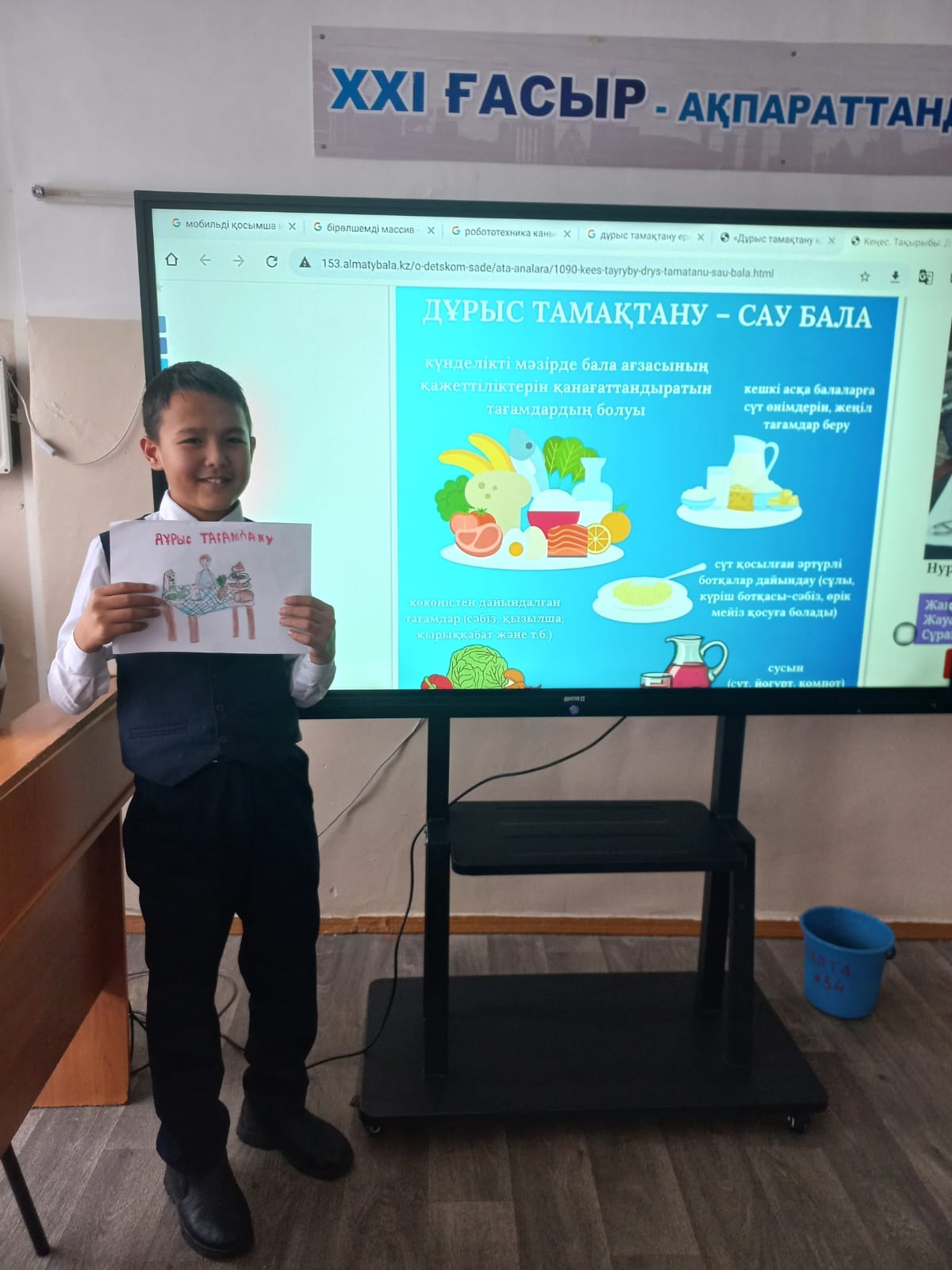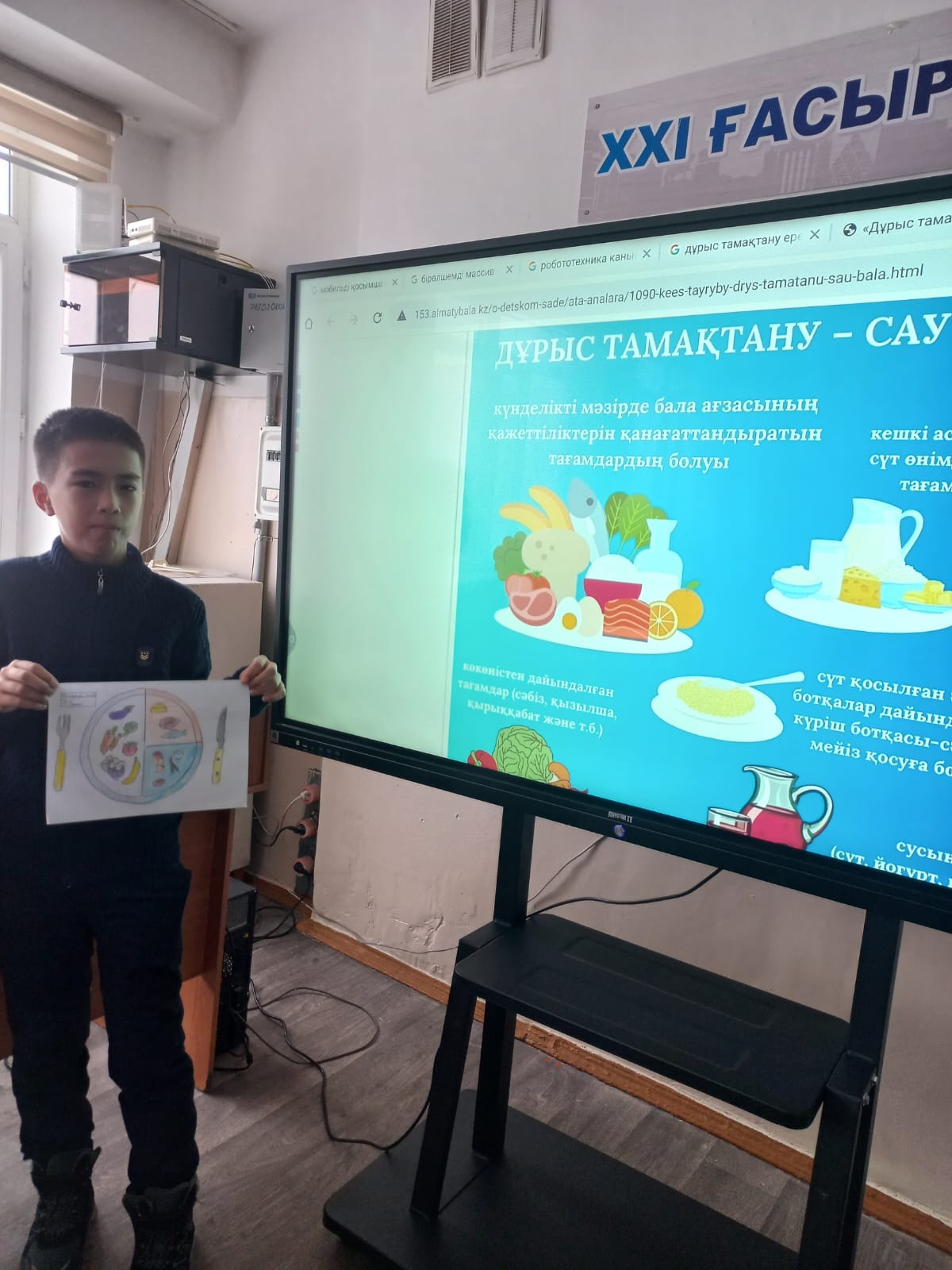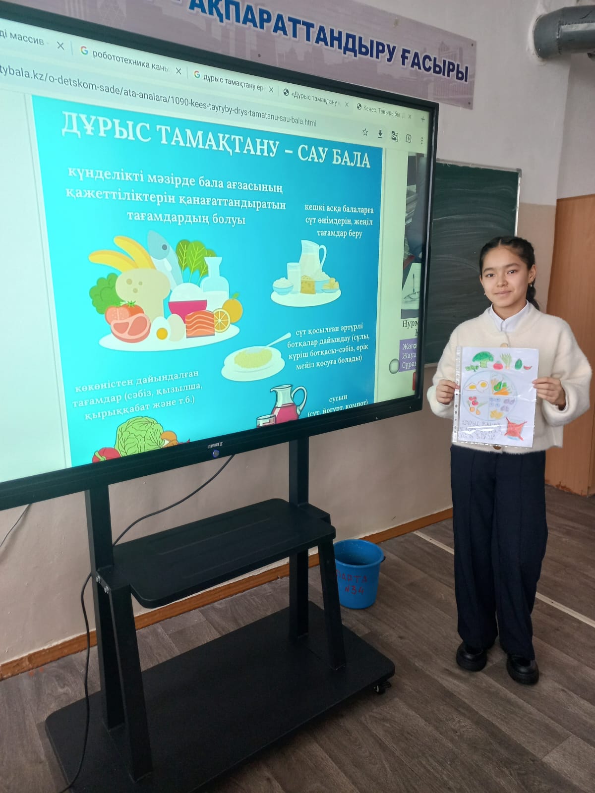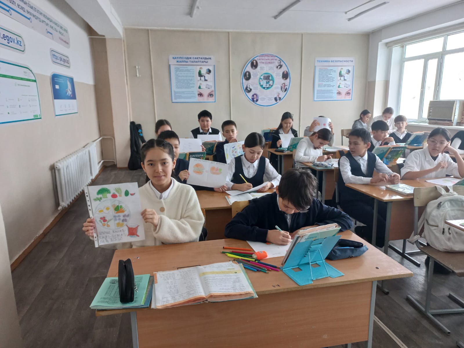 7-сыныппен "Дұрыс тамақтану - сау бала" тақырыбында сынып сағаты өткізілді. Сабақ барысында оқушылар дұрыс тамақтану ережелерімен, дұрыс тамақтану пирамидасымен танысып, тақырыпқа сай суреттер салып, оларды қорғады. Адам денсаулығы тамақтануға байланысты екенін бойларына сіңіре алды.