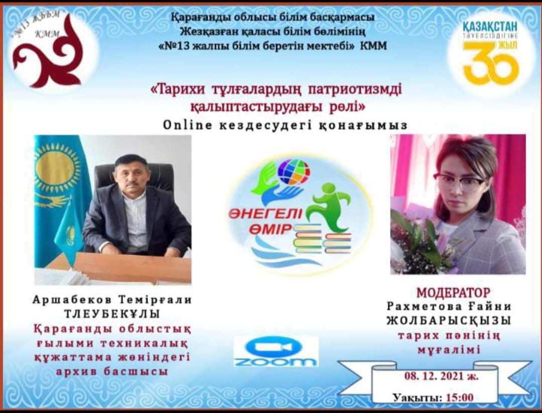 2021 жылғы 8 желтоқсанда "Өнегелі өмір" жобасы аясында тарих пәнінің мұғалімі Ғайни Жолбарысқызының ұйымдастыруымен 8 - 10 сынып оқушылары және мектеп ұстаздарының қатысуымен онлайн кездесу өтті.
