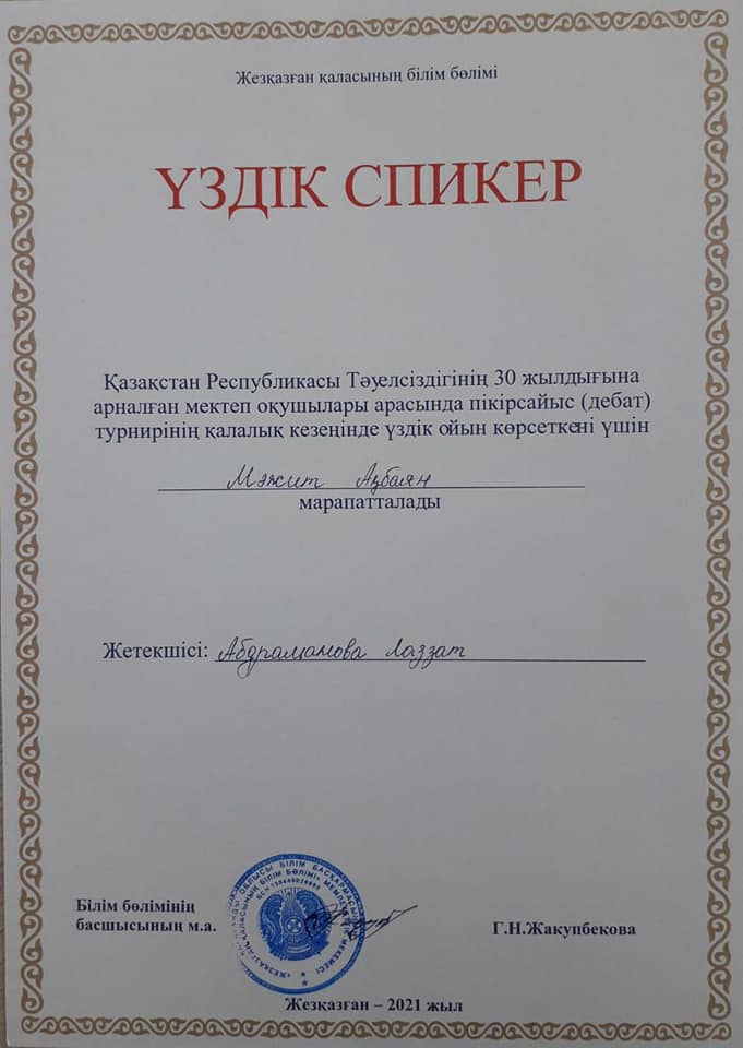 Қазақстан Республикасы Тәуелсіздігінің 30 жылдығына арналған мектеп оқушылары арасындағы пікірсайыс турнирінің қалалық кезеңінде үздік ойын көрсеткені үшін 9 Е сынып оқушысы Мәжит Ақбаян "Үздік спикер" атанды. Жетекшісі: Абдраманова Л.П.