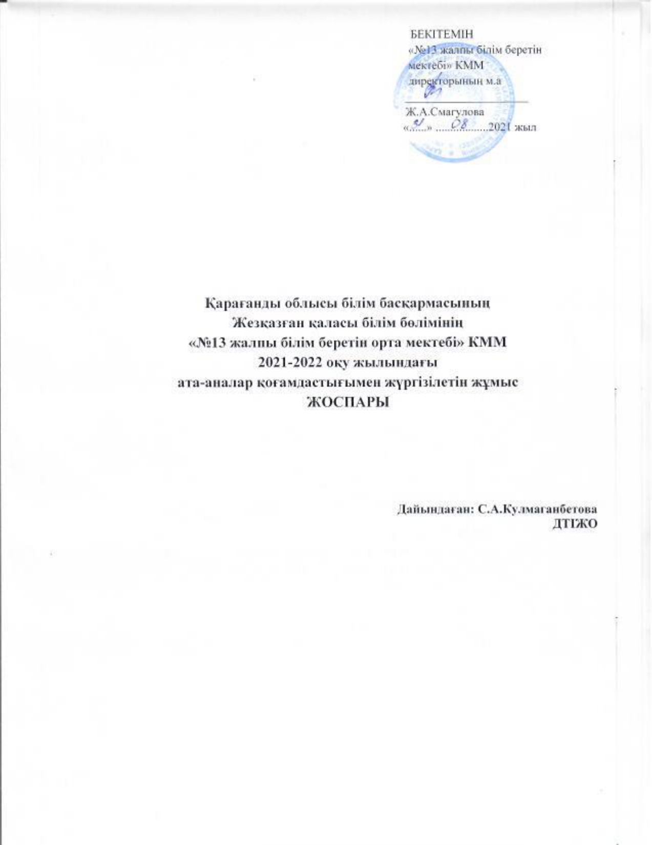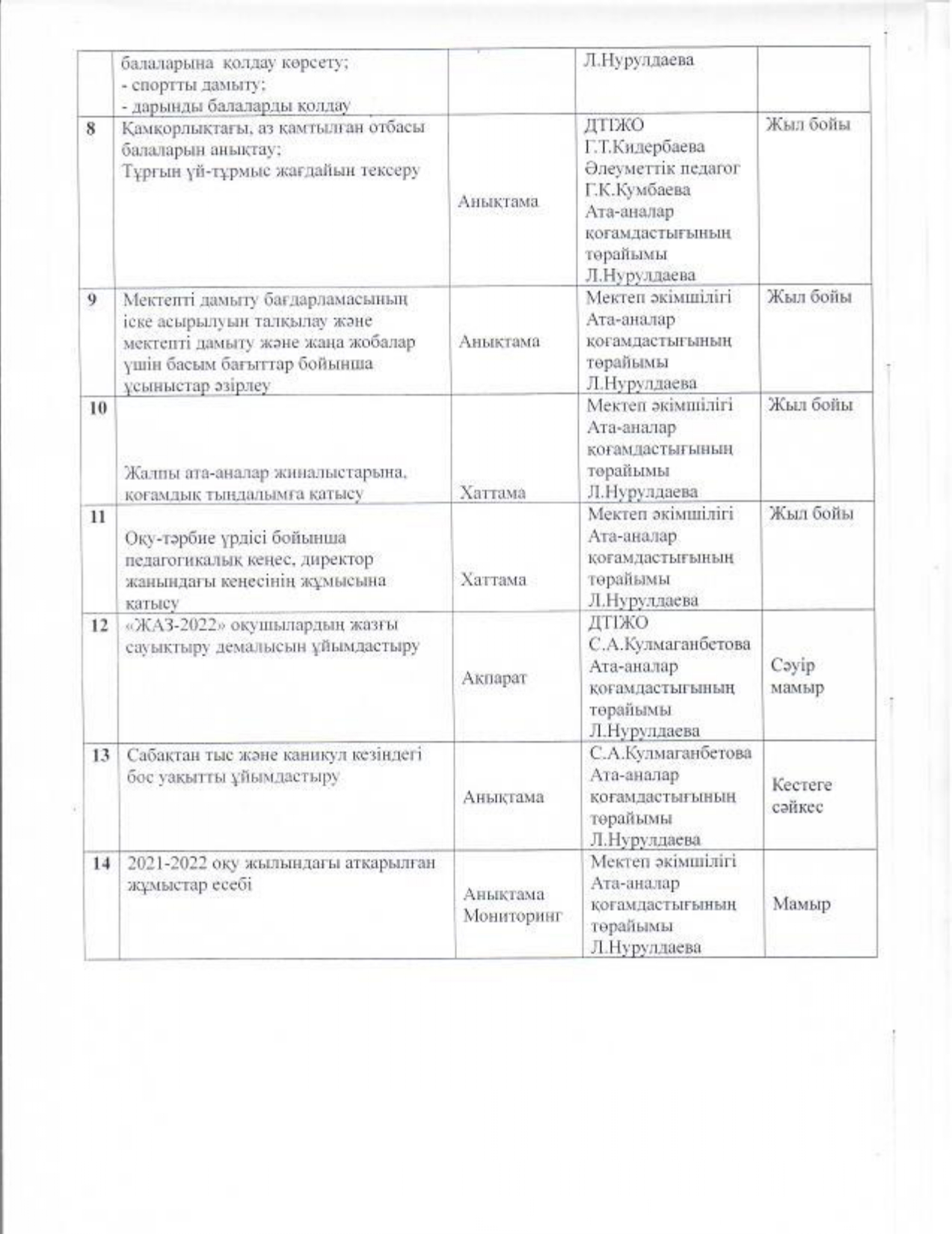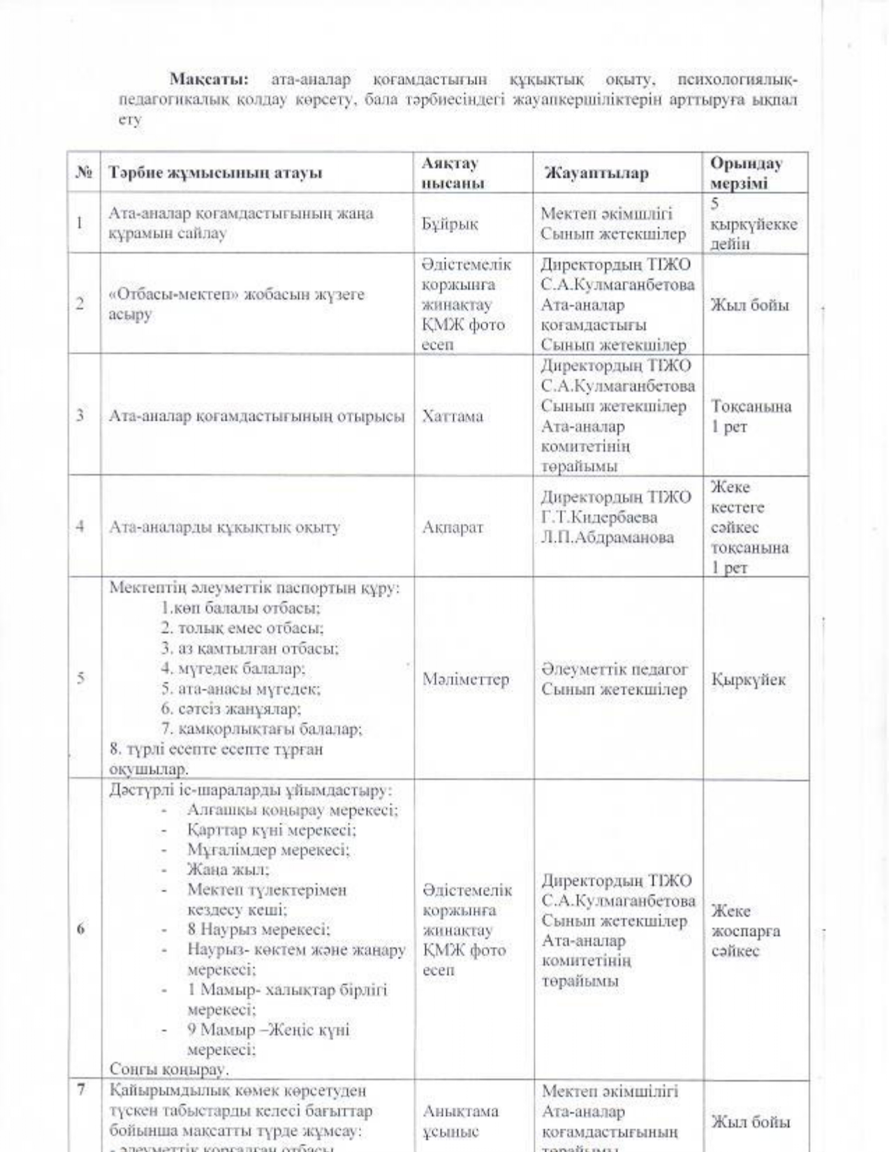2021-2022 ж ата-аналар қоғамдастығымен жүргізілетін жұмыс жоспары