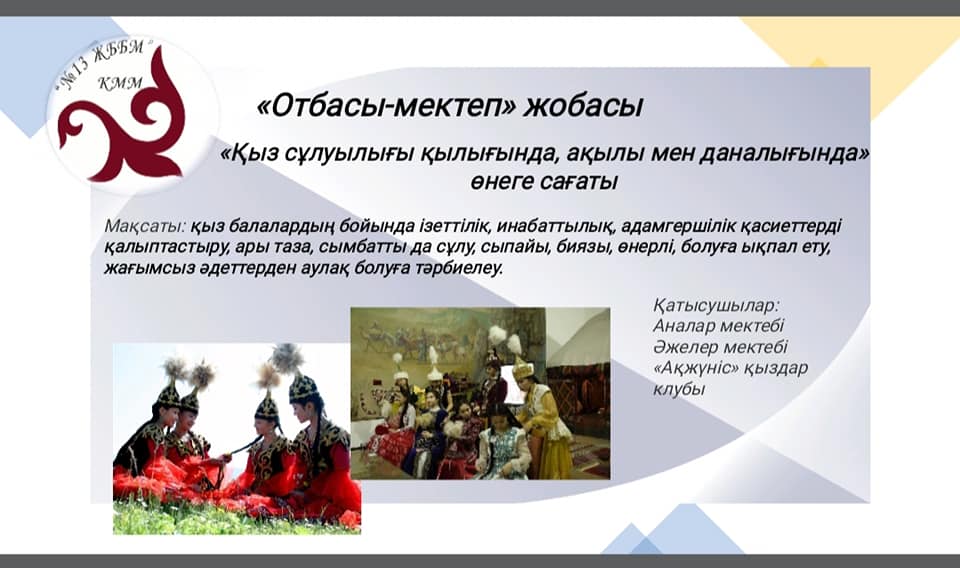 «Отбасы –мектеп» жобасы шеңберінде отбасының тәрбиелік әлеуетін, білім алушылардың ата-аналарымен қарым-қатынасын үйлестіруге бағытталған «Әжелер мектебі», «Аналар мектебі» өкілдерінің қатысуымен «Қыз сұлуы қылығында, ақылы мен даналығында» өнеге сағаты өтті. Мақсаты - қыз балалардың бойында ізеттілік, инабаттылық, адамгершілік қасиеттерді қалыптастыру, ары таза, сымбатты да сұлу, сыпайы, биязы, өнерлі, болуға ықпал ету, жағымсыз әдеттерден аулақ болуға тәрбиелеу. Іс-шара барысында қыз балаларға аналар мен әжелер ұлттық құндылықты дәріптей отырып, ақыл-кеңестерін берді, өнегелі әңгіме өрбітті.