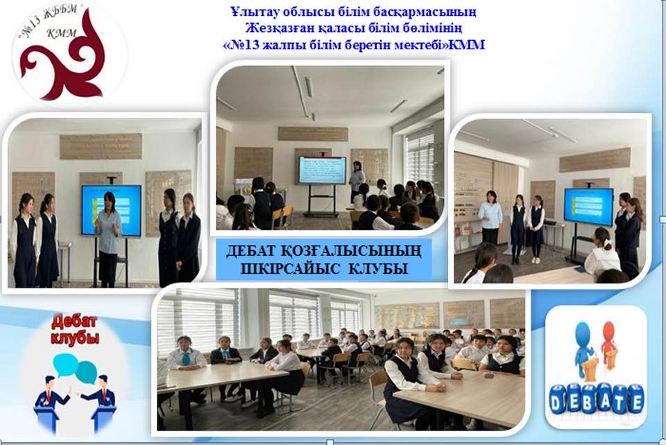 Мектеп Парламентінің Дебат қозғалысы фракциясының ұйымдастыруымен 5-9 сынып білім алушыларына “Жастары белсенді елдің ертеңі жарқын” тақырыбында оқыту сағаты өткізілді. Дебат қозғалысы клубының жетекшісі Л. Абдраманова жаңадан қабылданушыларға АПФ құрылымы, негізгі ережелері туралы ақпараттар берілді. Сонымен қатар ойын барысында жіберілетін қателіктер айтылды. Белгілі бір фактілерді зерттеу, болжау, жүйелеп сөйлеу, өз көзқарасын ашық та жүйелі дәлелдеу, өз пікірін дұрыс ұсынуға бағыт-бағдар берілді.