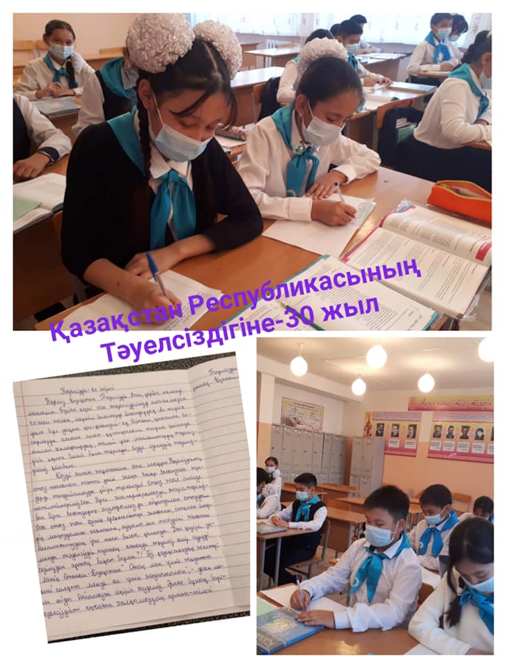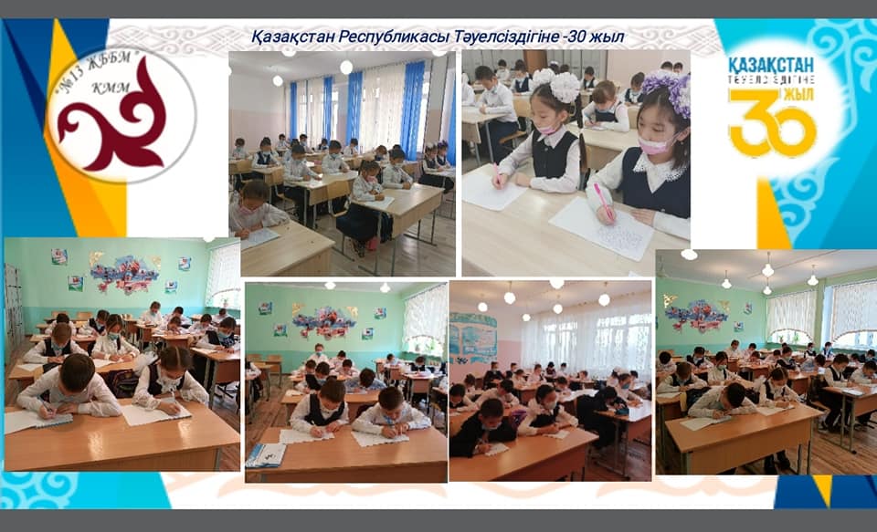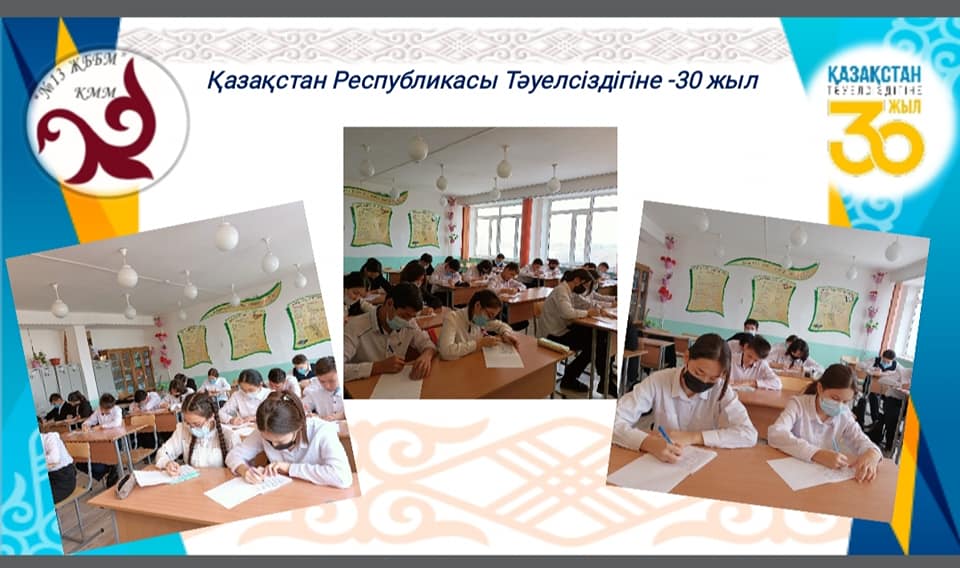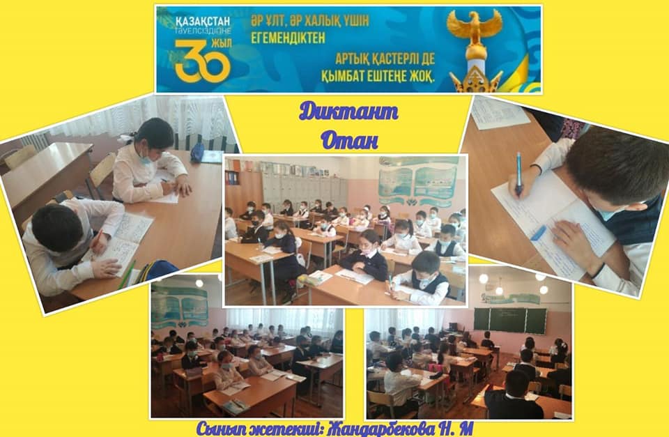 Қазақстан Республикасы Тәуелсіздігінің 30 жылдығына орай білім алушылардың мемлекеттік тілде жазу мәдениетін дамыту, сауаттылығын қалыптастыру, мәтін мазмұны арқылы ұлттық құндылықтарды білім алушылардың бойына сіңіре отырып, патриоттық тәрбие беру мақсатында 2-11 сыныптарда диктант алынды. Диктант мәтіні әрбір сыныптың жас ерекшелігіне сай жүргізілді. Найзаның ұшымен, білектің күшімен келген егемендігіміздің еңсесі биік, тұғыры жоғары болатынын жас ұрпақтың бойына сіңіре білу. Әрбір мәтін мазмұны туған жерге деген зор құрметті, аса үлкен жауапкершілікті паш еткендей! Егемендігіміз еңселі, Тәуелсіздігіміз тұғырлы болғай!