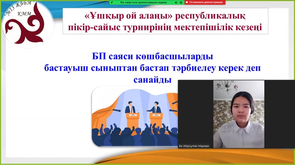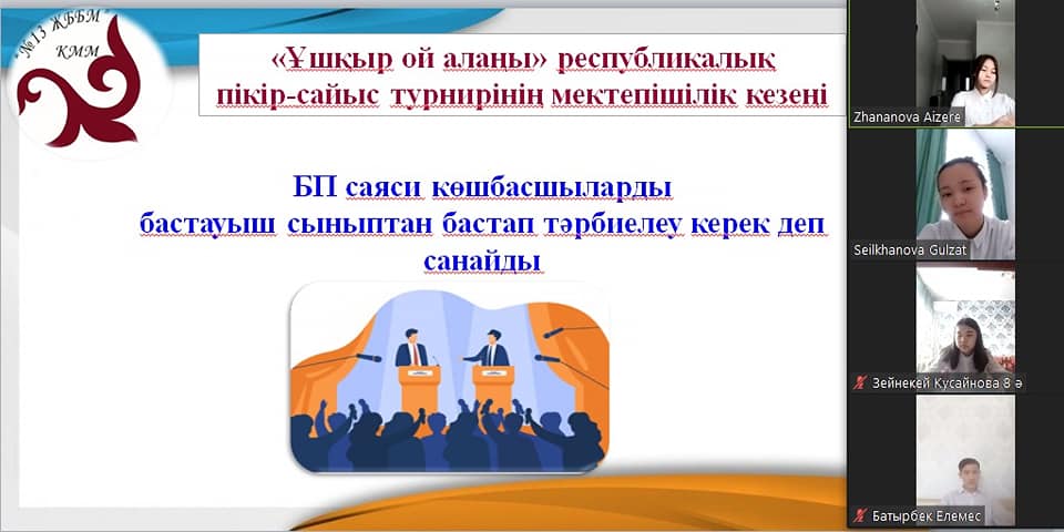 Ұшқыр ой алаңы" пікір-сайыс турнирінің мектепішілік кезеңінде мектебіміздегі дебат клубының екінші топ қатысушылары қатысып, сайысқа түсті. Қарар тақырыбы :" БП саяси көшбасшыларды бастауыш сыныптан бастап тәрбиелеу керек деп санайды" тақырыбы бойынша пікір таластырды."Болашақ" және" Ақиқат" тобындағы спикерлер тақырып бойынша өз кейстерін ұсынып ортаға салды.Көшбасшылық -бұл талант. Көшбасшы болу үшін табандылық, ақыл, жылдамдық,ынта, өзіне деген сенімділік , білімге деген құштарлық, әділеттілік, ең бастысы Отанға деген сүйіспеншілігі жоғары болу керек деп ойларын қорытындылады.Пікірсайыс нәтижесінде "Болашақ" тобы қалалық кезеңге жолдама алды.
