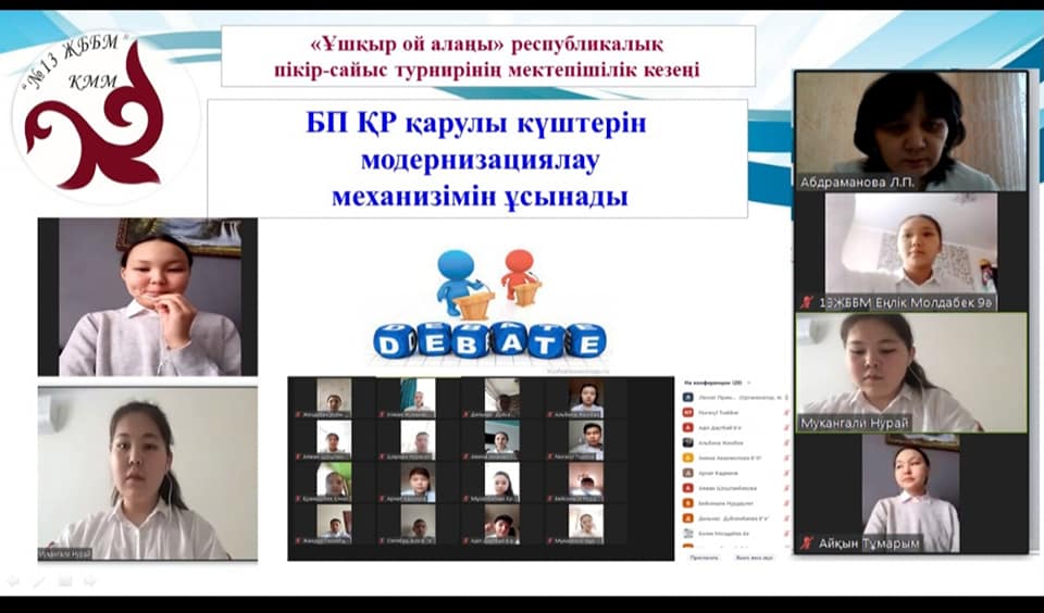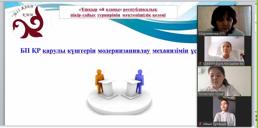 Мектебімізде "Ұшқыр ой алаңы" пікір-сайыс турнирінің мектепішілік кезеңі өтті. Турнирге 8-9 сынып оқушылары қатысты.Қарар тақырыбы :" БП ҚР қарулы күштерін модернизациялау механизімін ұсынады" ,"БП жаһанданудың пайдасынан зияны көбірек деп есептейді" тақырыптарындағы қарарлар бойынша пікір таластырды."Парасат" және" Жалын" тобындағы спикерлер ортаға тақырыптар бойынша өз кейстерін ұсынып : Қарулы Күштер агрессияға тойтарыс беруге, Қазақстан Республикасының аумақтық тұтастығы мен егемендігін қару-жарақпен қорғауға, мемлекеттік және әскери объектілерді күзетуге және қорғауға, әуе кеңістігін күзетуге, сондай-ақ Қазақстан Республикасы бекіткен халықаралық шарттарға сәйкес міндеттерді орындауға дайын болу керектігі пікірсайыста айтылды. "БП жаһанданудың пайдасынан зияны көбірек деп есептейді" тақырыбында жаһандану неге әкеліп соқтырады?сұрақ төңірегінде пікірсайыста оқушылар өз ойларын ортаға сала білді.Пікір сайыс нәтижесінде " Парасат" тобы қалалық дебат турниріне жолдама алды.